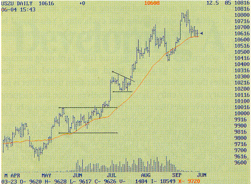 이제 가격은 이동평균(moving average) 보다는 위에 있지만, trading range의 최고치 보다는 아직도 낮다. 가격이 상승추세(uptrend)인가?, 아직도 보합추세(sideway)인가? 시장 가격 구조와 추세의 저항, 지지선들이 나타나지 않은 단순한 이동평군(moving average)은 추세(trend)를 제대로 알아낼 수가 없다. 이 점에서 가격과 관련이 없는 다른 필터(filter)들도 시스템에 응용될 수 있다. 그런 필터(filter)들은 기본적인 것들, 계절적인 것들, 감정적인 것들, 공개된 관심과 기본적 관계를 포함한다.