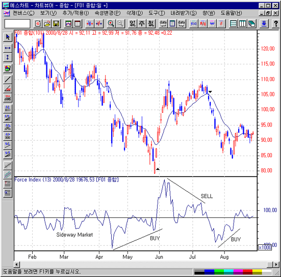 1) 우선 기준선 0선(Center Line) 위에 Force Index이 위치하고 있으면 매수세력이 시장을 장악하고 있는 것이고, 기준선 아래에 있으면 매도세력이 시장을 장악하고 있는 것입니다.