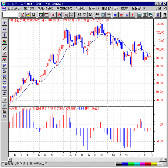 TS 시스템은 장기 차트 분석으로부터 먼저 시작합니다. 저자는 13주 MACD Oscillator를 기준으로 해서, Tick이 상향이면 Uptrend로 규정하고, Tick이 하향이면 Downtrend로 규정합니다.