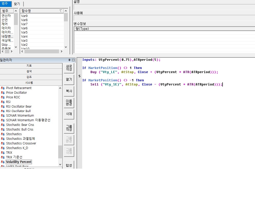 하기와 같은 코딩 내용중, " ATRperiod(5)는 (TR=고가-시가)의 5평균값으로 명확기 정의가 되는데 VtyPercent(0.75)의 경우 Log값의 제곱근으로 이해는되나 명확히 수학적 산식이 코딩 내용으로는 잘 알수 없어서 이에 대한 설명을 부탁드리는 바입니다.