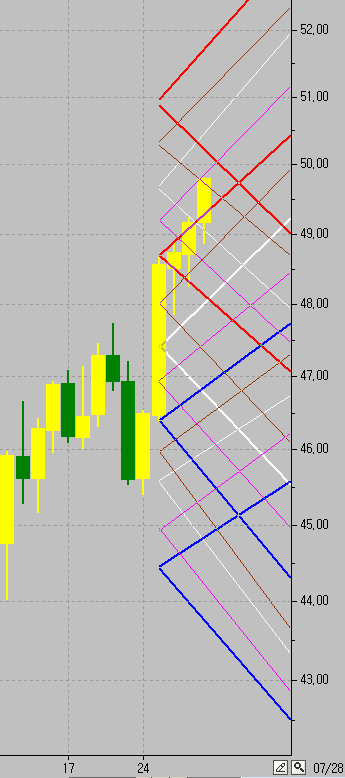 첨부한 그림과 같이 특정한 날짜의 일봉에서 고점, 저점, 중심, 25% 지점과 75% 지점에서 적당한 각도로 상방과 하방으로 사선을 긋고 싶습니다. 그리고 그날 일봉의 고점에서 그날 폭의 25%, 50% 75% 100% 위 지점에서 역시 마찬가지로 상하 사선, 일봉의 저점에서 아래쪽으로 25%,50%,75%,100% 지점에서 상하 사선을 그리고 싶습니다.