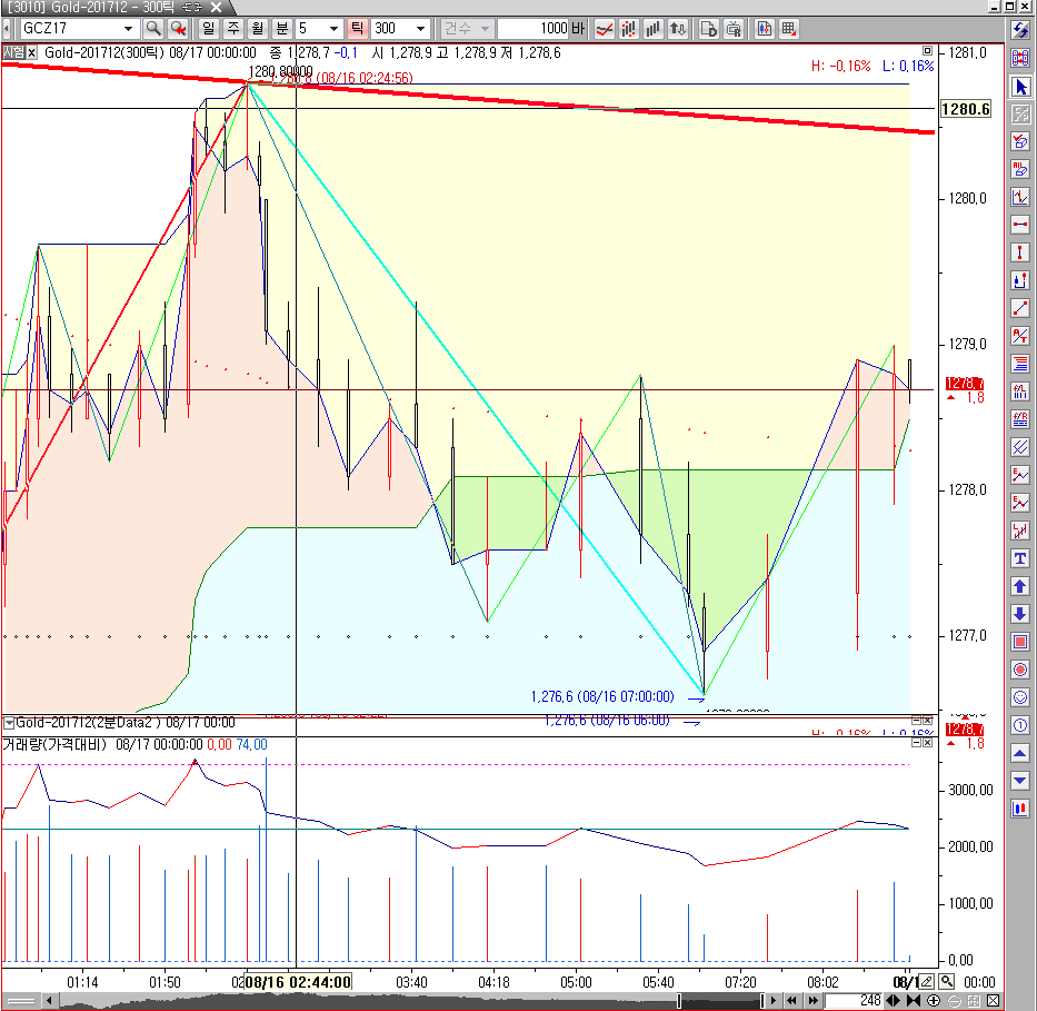 > 300틱주차트에서 2분거래량을 같이보려고 함니다.그림과 같이 2분을 참조로 300틱으로 바꾸면 주차트의 봉간격이 2분에 맞추어집니다,2번그림과 같이 틱차트의 봉간격이 일정하게 2분거래량을 볼수 잇는방법을 알려 주시기 바랍니다