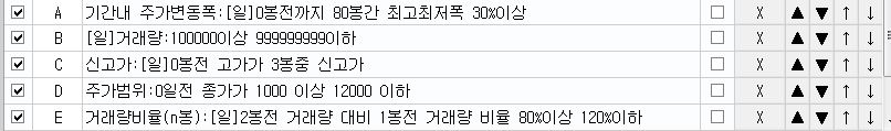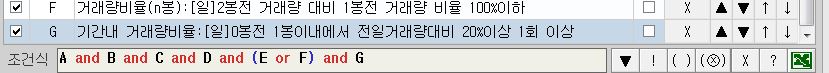 3. 일봉에서 1일전 거래량이 2일전 거래량 비율 80%<x<120%