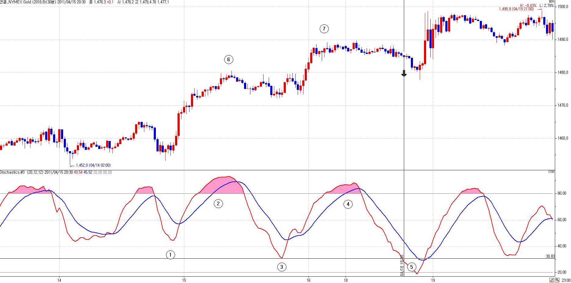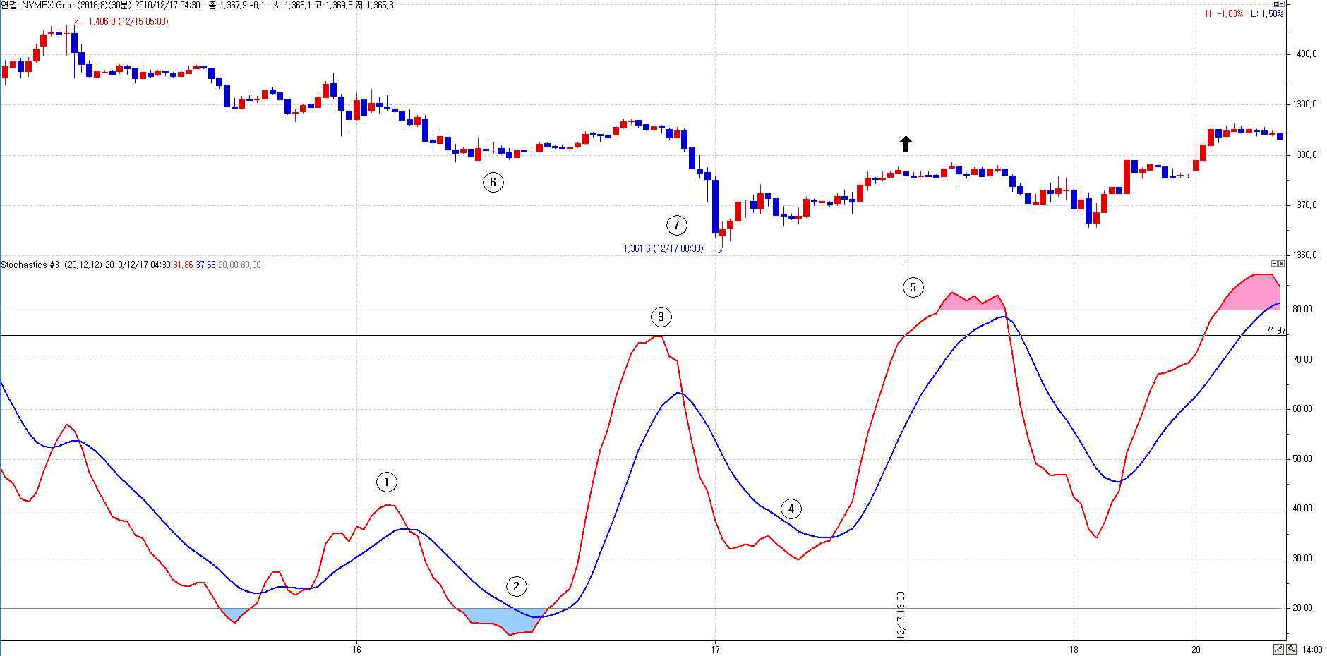 즉, 스토케스틱 다이버전스가 위의 조건들을 충족시키고 나온 이후 사진에서 5번 K선이 3번 K선보다 높아지는 그 순간 화살표 상승신호가 나오게 하려합니다.