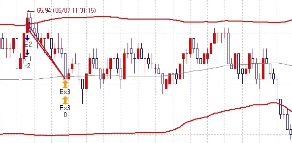 > 볼밴 상단선(BBtop)에서 2개 매도 진입("매도1", "매도2")한 후