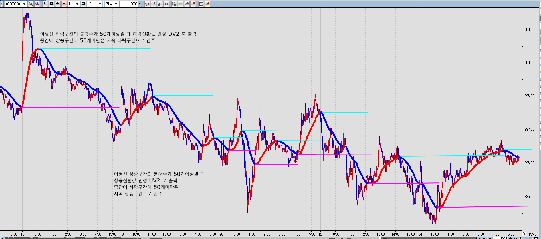이평선 하락구간의 봉갯수가 50개이상일 때 하락전환값 인정 UV2 로 출력