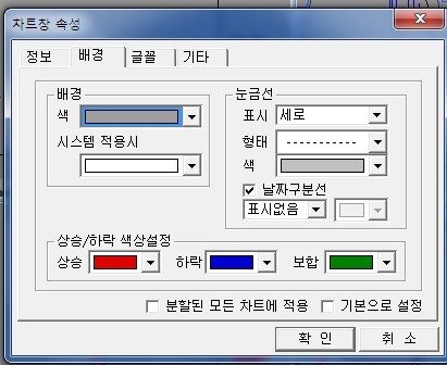 차트의 바탕화면을 더블클릭하면 차트창속성이 나타납니다.