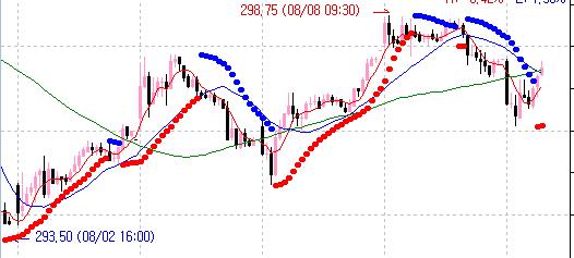 파라볼릭 (0.02, 0.2)을 적용하여, 파라볼릭이 상승추세에서만(그림에서 빨간점 위에서만)