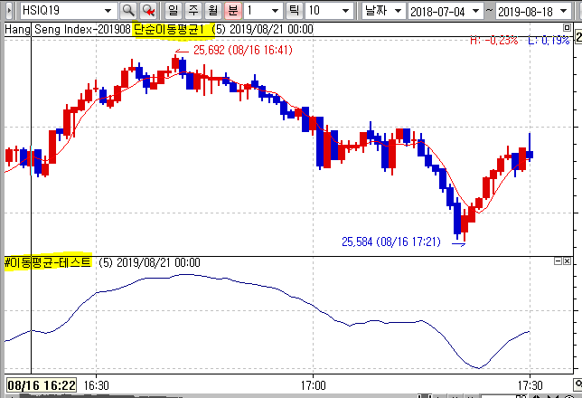 > 제가 지표식을 공부하고 있습니다. 아래와 같이 Built-in으로 제공되는 지표식인 "단순이동평균1"을 "#이동평균-테스트"라는 이름으로 복사를 하고 시뮬레이션 챠트에 적용을 해보았는데요...