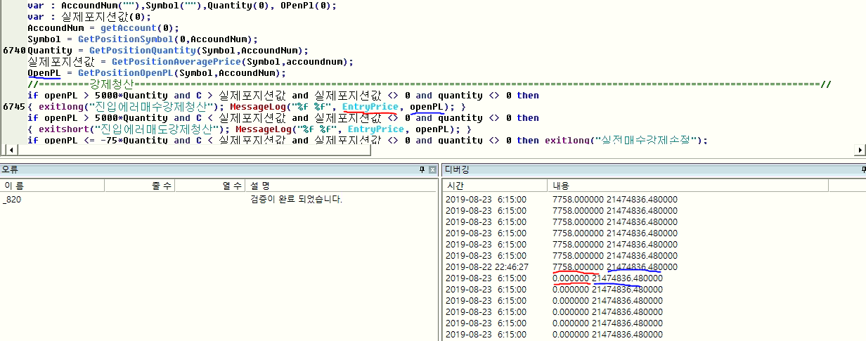 포지션 함수의 진입값과 포지션 함수의 평가손익을 출력한 메시지 로그입니다.