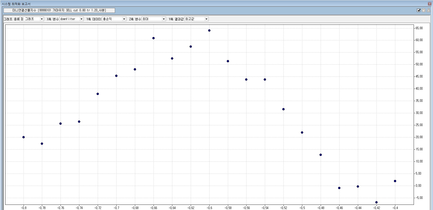 해당 그래프는 각 최적화 조합별로 손익을 찍은 점 그래프입니다.