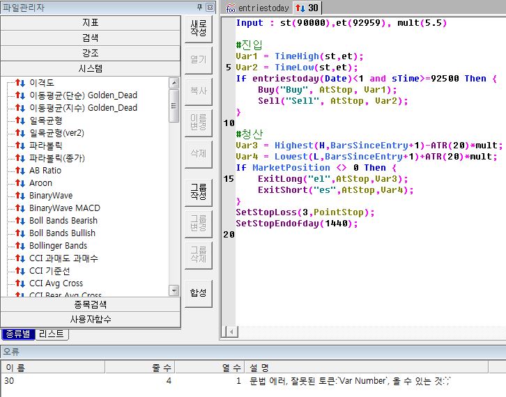 안녕하세요 예스스탁입니다. 외부변수(input)를 선언하고 마지막에 ; 을 표시하셔야 합니다. input : st(90000),et(92900),mult(5.5); 즐거운 하루되세요 > ababab 님이 쓴 글입니다. > 제목 : 문의드립니다 > 30mbo 전략을 하고싶은데 어떤부분에서 에러인건지를 잘 모르겠습니다.