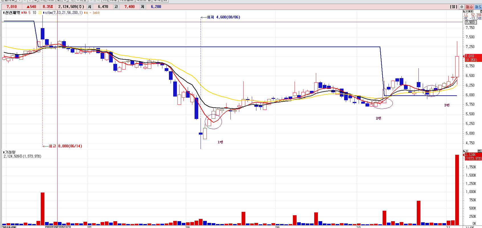> 1.장대 거래가 터진 후 하락 하던 주가가 1번에 저점 보다 2번이 높아야 되고,(5일선이 20일