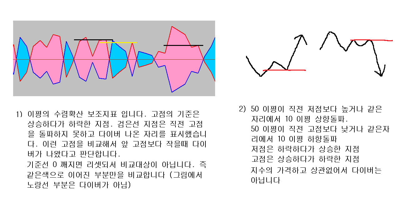 1) 10 이평을 하향돌파 했을때 첨부파일 그림처럼 수렴확산 지표에서 다이버가 있으면 매도하는 수식을 알고 싶습니다. 수렴확산은 50 이평과 80 이평으로 부탁드려요. 혹시 가능하다면 설명 달아주시면 감사하겠습니다