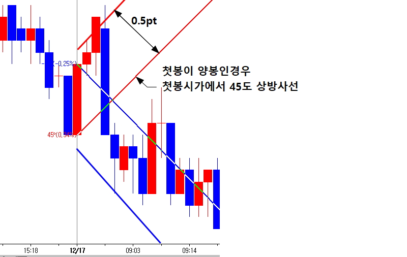 양봉이면 종가에서 하방 45도 사선, 시가에서 상방 45도 사선