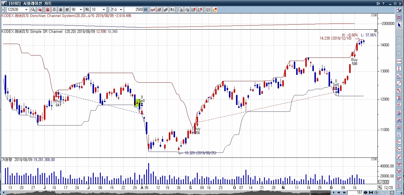 상기 전략으로 20일 고가 저가 채널 돌파 시스템을 만들었습니다.
