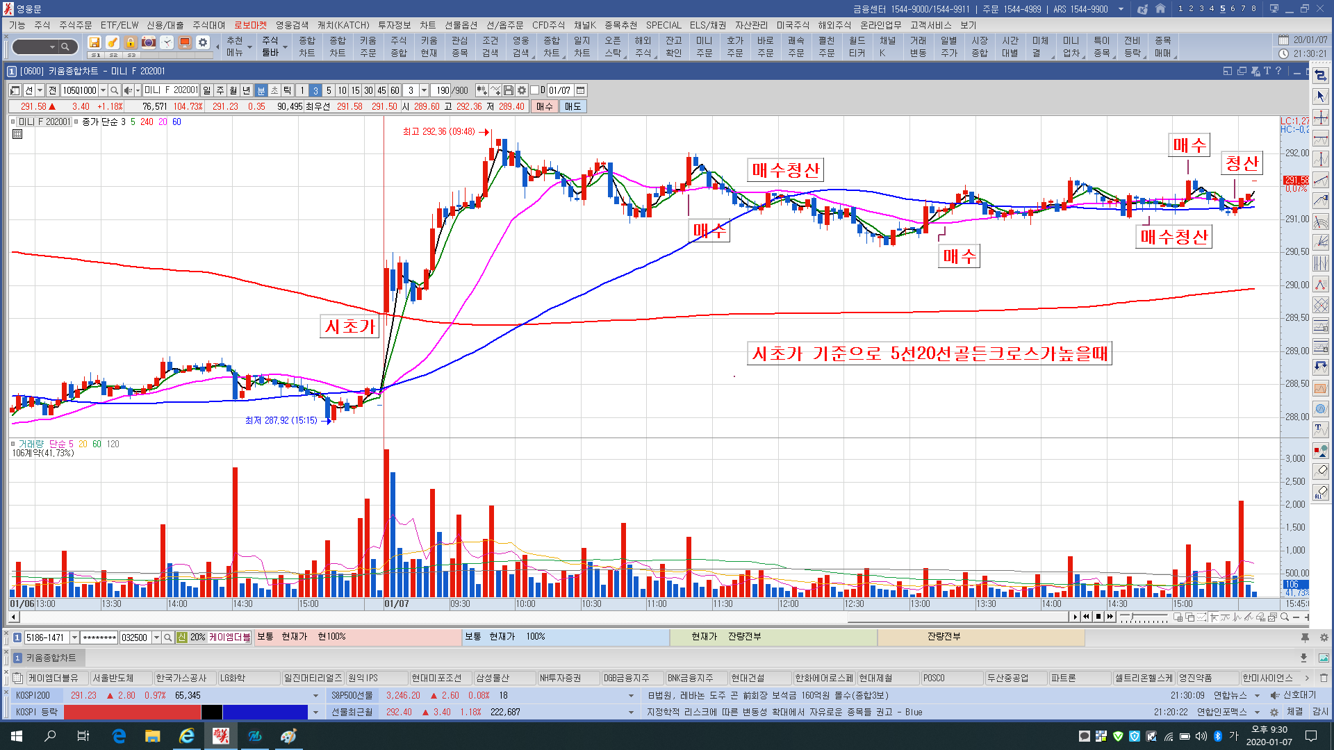 아침에 장 시작할 때 시초가 기준으로 시초가 보다 높을 때 가격으로만 5선 20선 골든크로스 매수 5선 20선 데드크로스 매수청산 하는 수식 부탁드립니다.