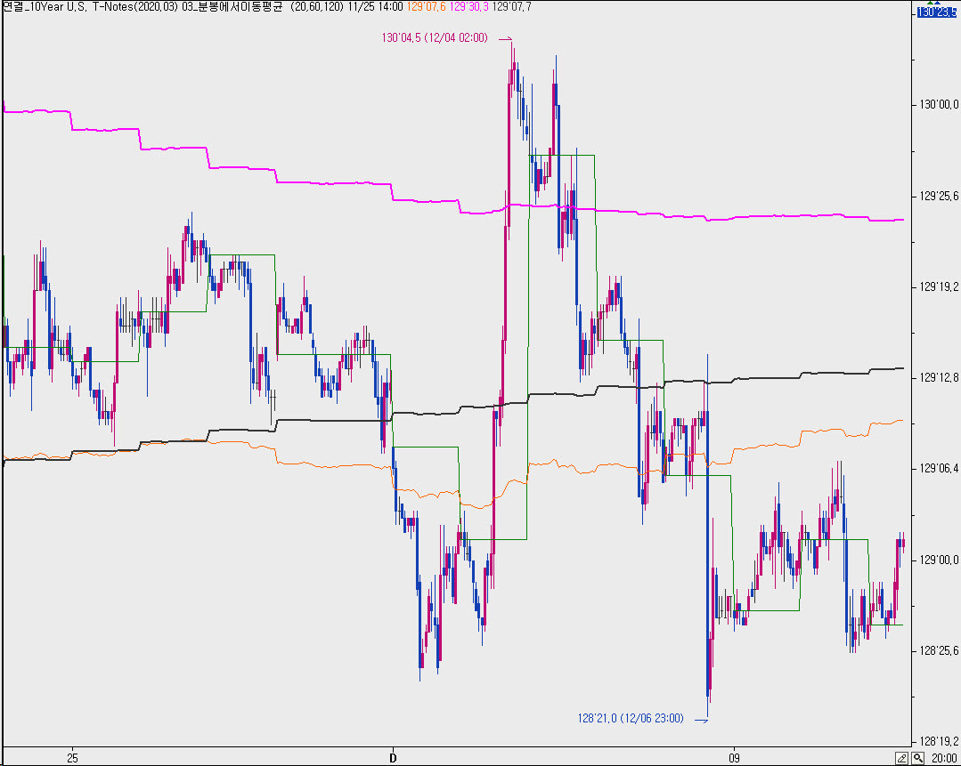 분봉에서 이동평균선(20일, 60일, 120일)을 보여주는 수식입니다.