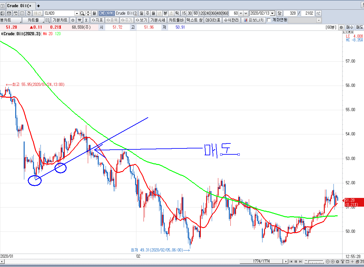 ex) 51.20(조정 중 고점 하나) 51.00(조정 중 고점 둘) 추세선 설정