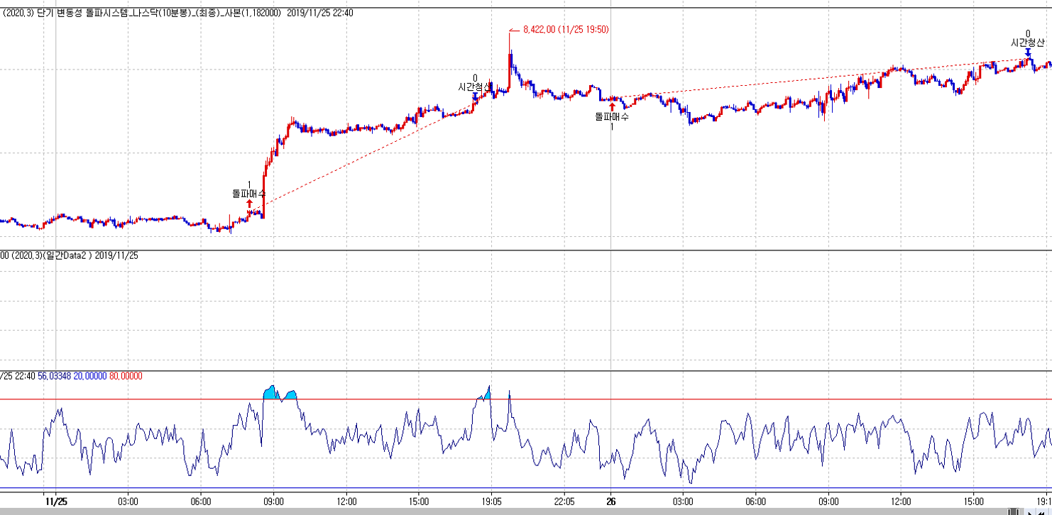 그림에서 보면 11월 25일 최고가가 8422.00인데요. 다음날 시가에 바로 매수신호가 들어오지 않나요?