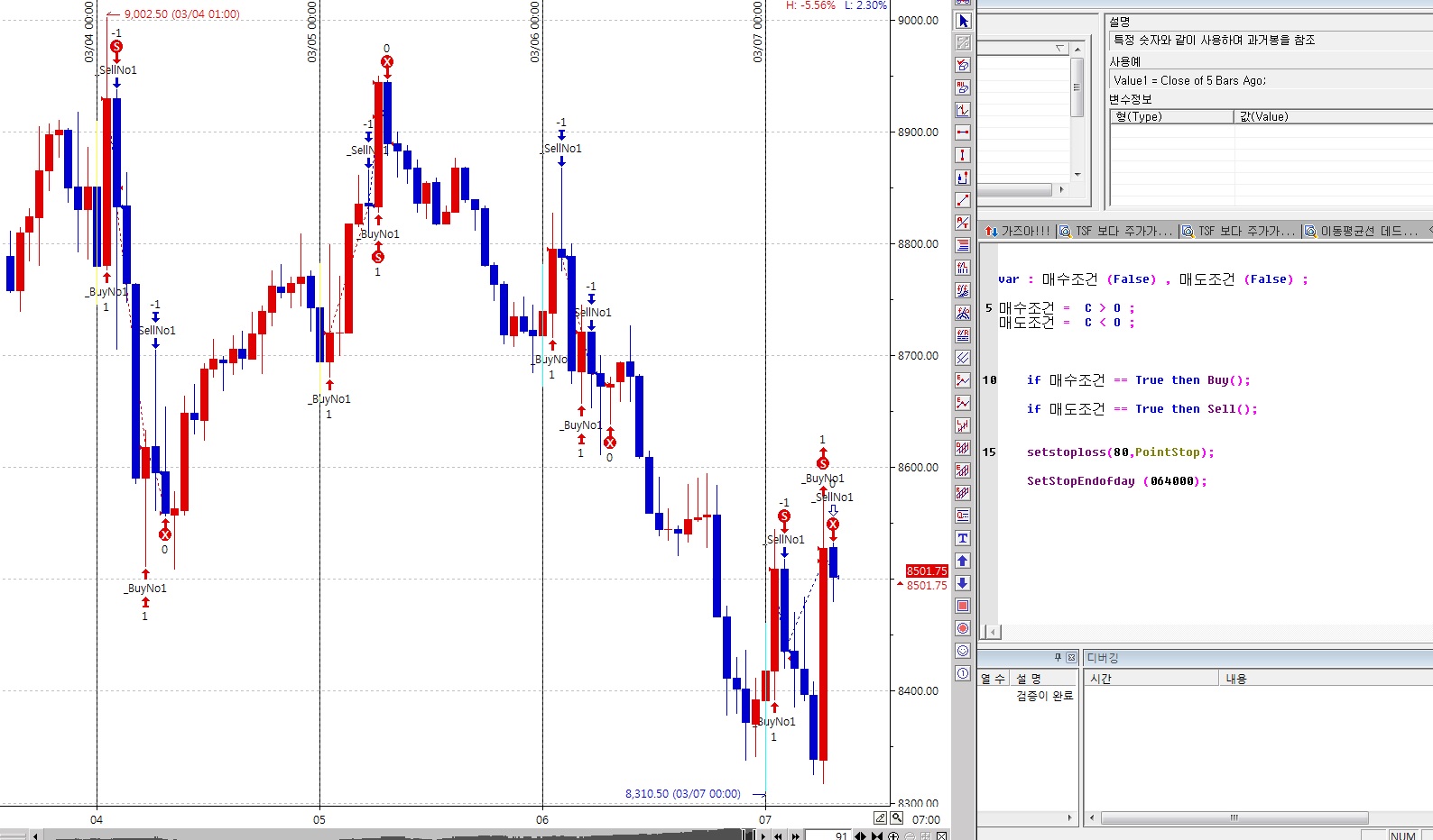 첨부된 파일보면 60분 봉인대요..차트상에 0시 이후로만 신호가 나오고 0시 이전으로는 신