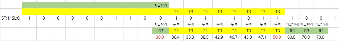 (T3가 50 도달 이후에 최근 10개에 대한 R3값에 의해 조건 발생)