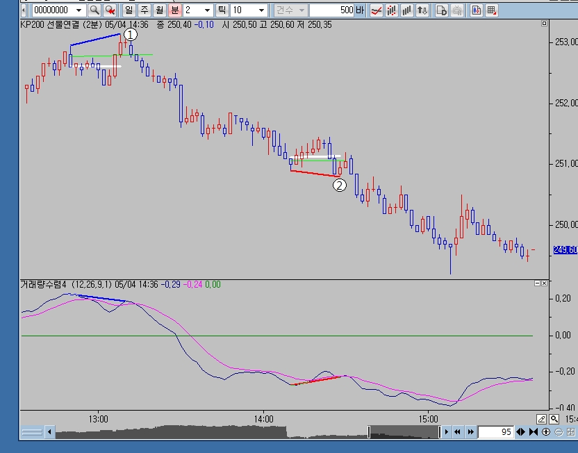 두번째 선은 추세선이 생기면 추세선 시작과끝의 구간의 ,해당구간 선물지수고점,저점 파악해서 만드는 구간저점고점의1/2선(첨부그림 그린선),이선은 지수두 출력하게 좀 해주세요.