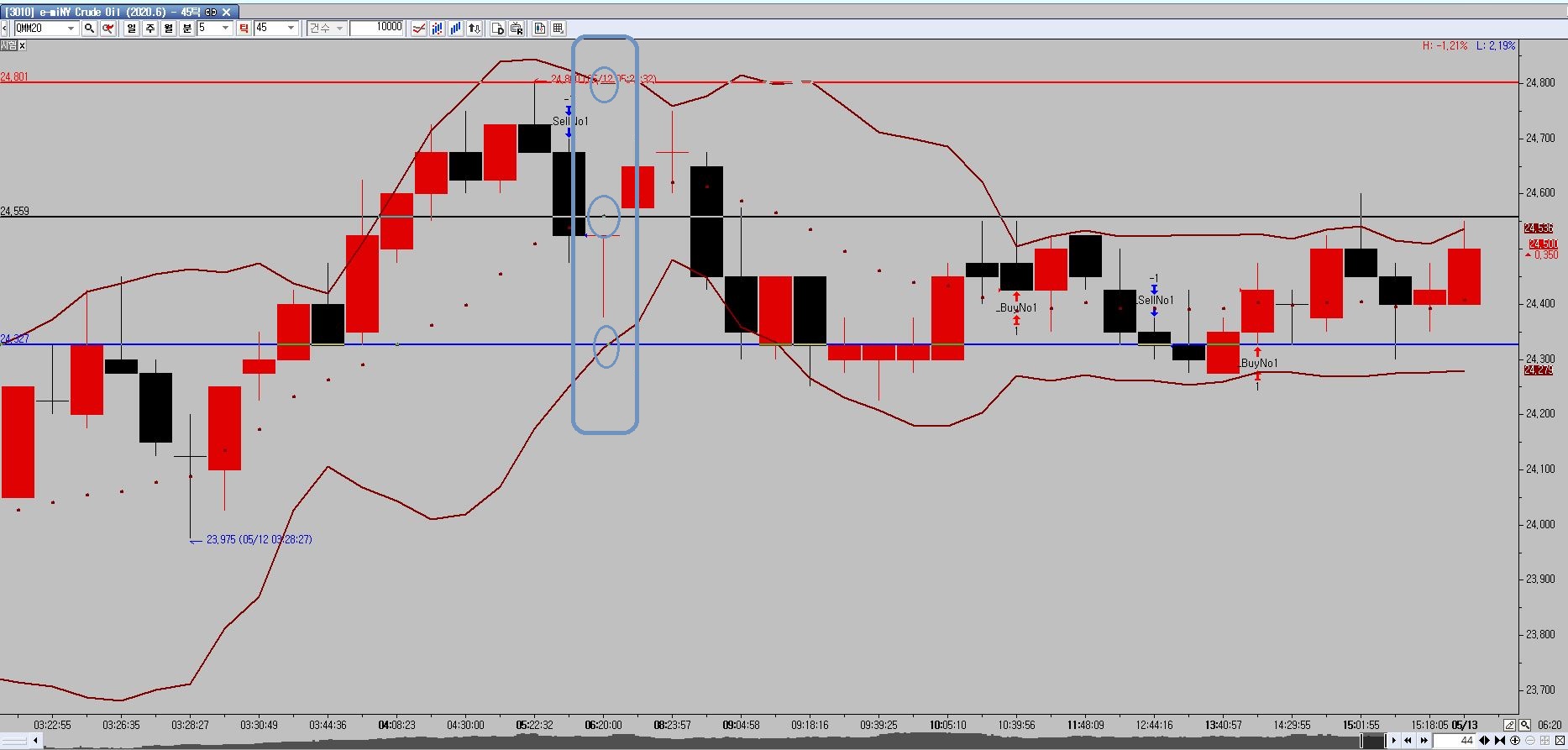 1. 미니 오일 45틱 차트를 실행하면 첨부한 그림과 같이 전일 장 종료 당시의