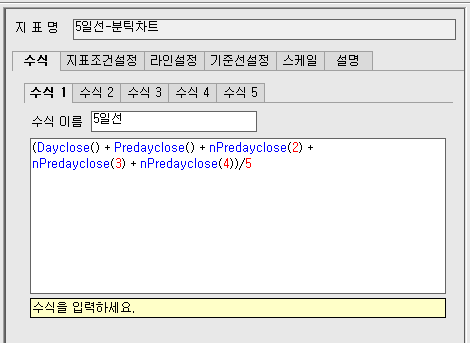 일봉상 단순이동평균 5일선 을 분봉차트에 나타내기를 한 키움의 수식을 예스로 부탁 합니다.