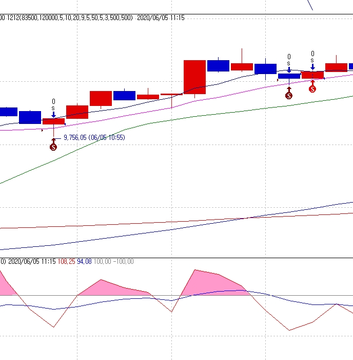 전양봉이 몸통으로 5 ,10,20,60,120 이평선중에 ( 순서는 상관없음) 2개 분봉 돌파