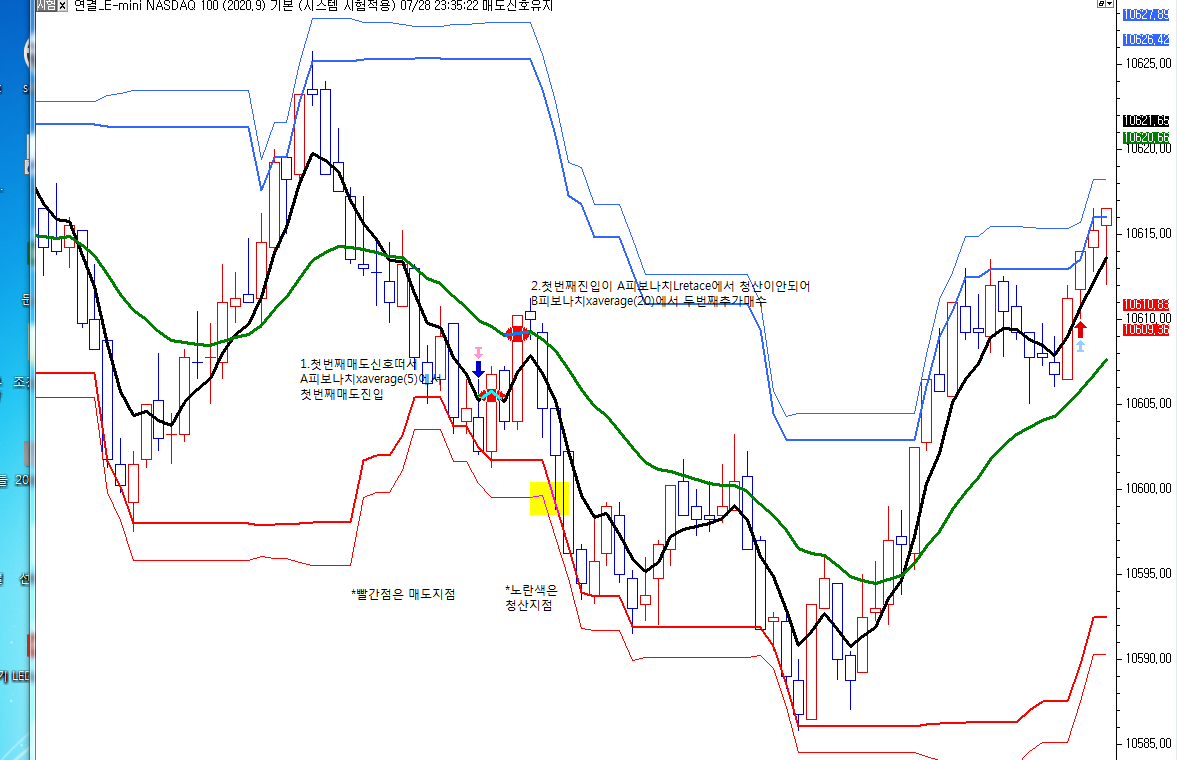 매도 조건 1.번 매도조건이 완성되고 + A(Fibonaccci Retrace Xaverage(5))선 3틱위에서 첫번째 매도