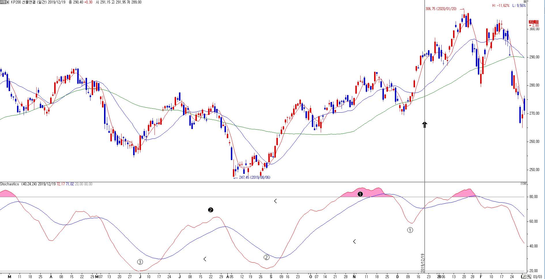 즉, 스토의 골짜기 최저점이 계속 높아지면서 봉우리의 최고점도 계속 높아질때 상승신호입니다.