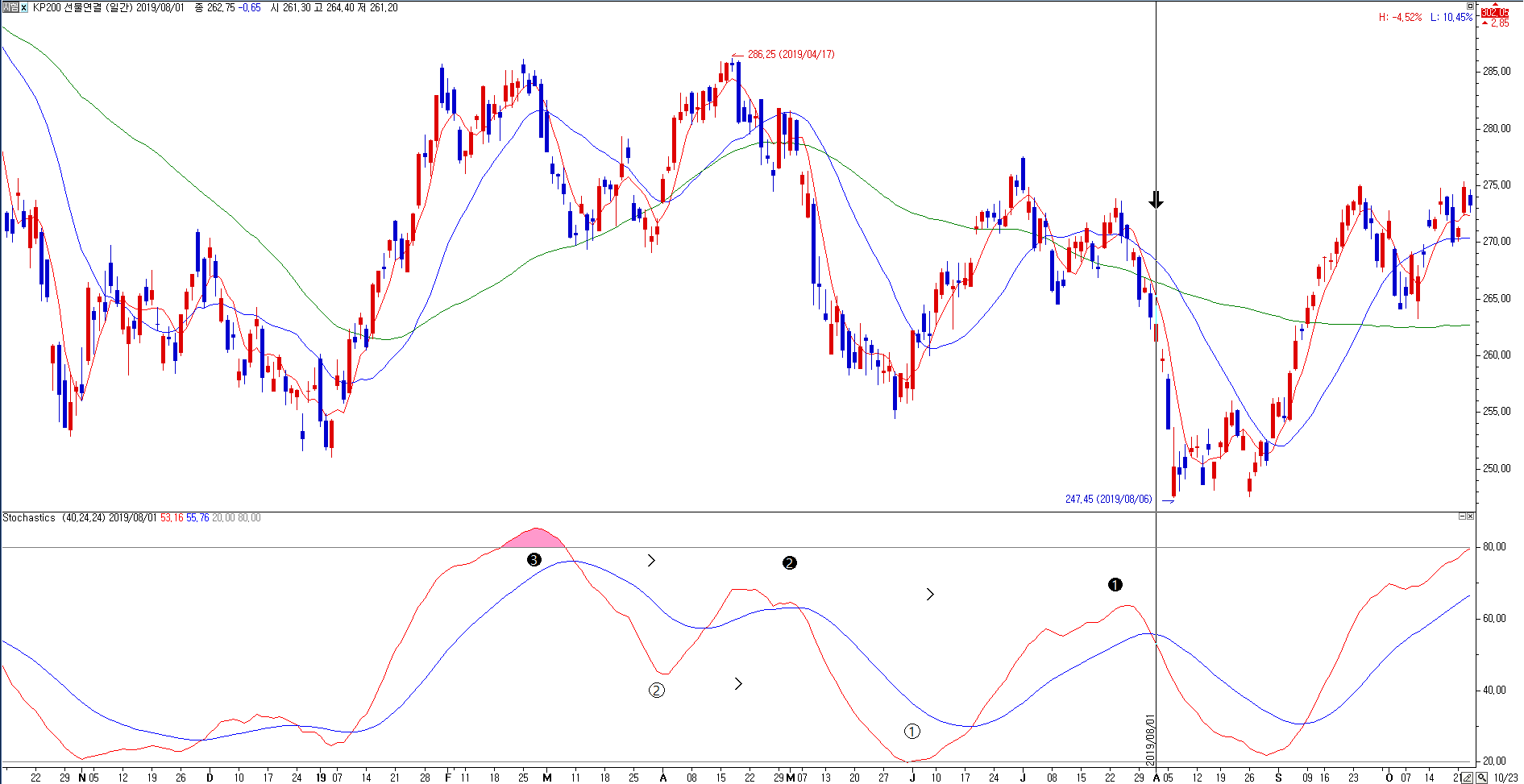 즉, 스토의 봉우리 최고점이 낮아지면서 골짜기 최저점도 낮아질때 하락신호입니다.