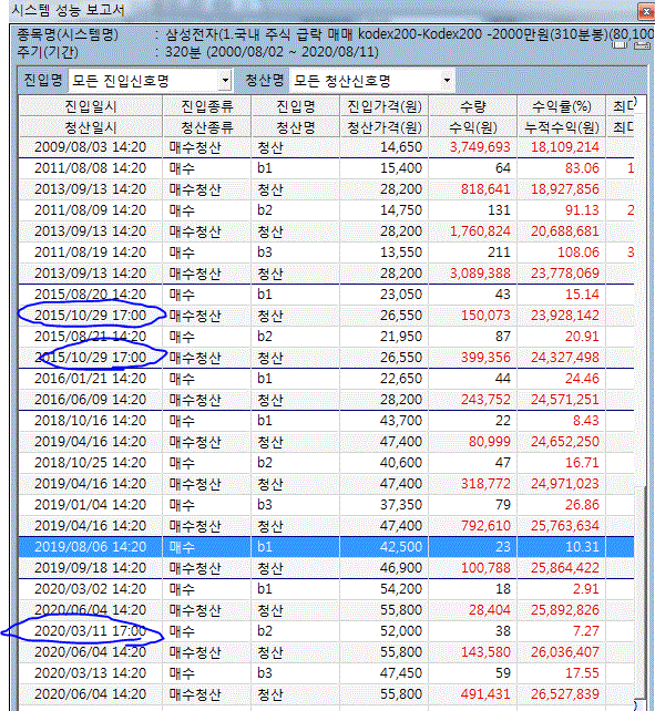 성능보고서를 보면 매수진입은 2시20분에 끝나는 봉에 진입하는데