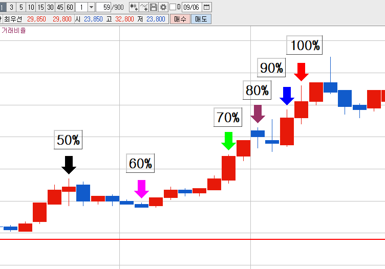 검색식으로 작성하시면 지정한 %도달봉에 점을 찍어 표시를 합니다.