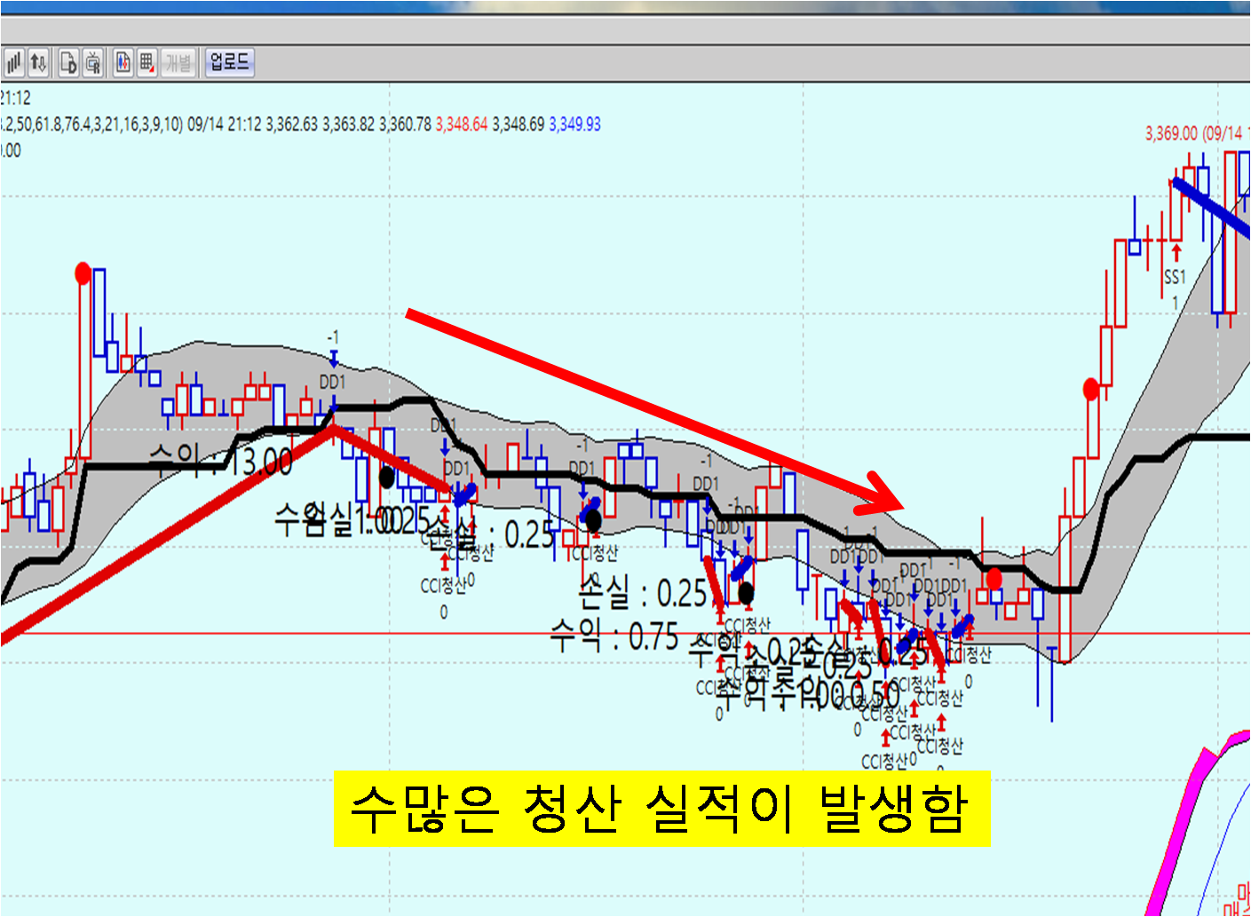 기준 : cci 수치가 3번 다운 신호 발생 하면 청산 인데 잘안되네요. <그림참조>