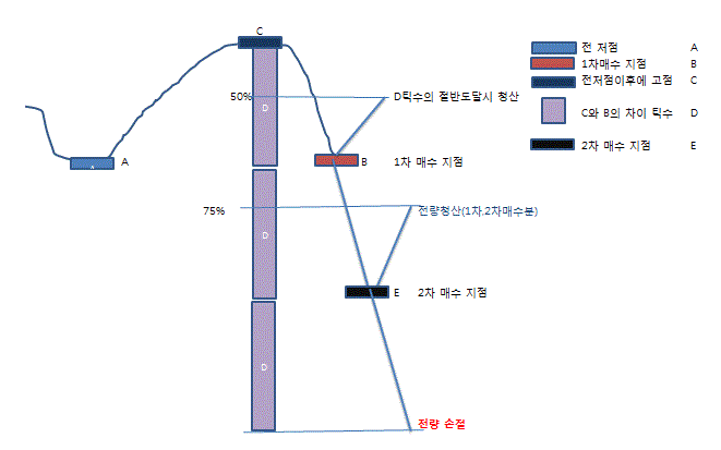 1차 매수후 D의 틱수(전저점과 전저점이후에 최고점의 차이틱수) 만큼 하락시 추가 매수