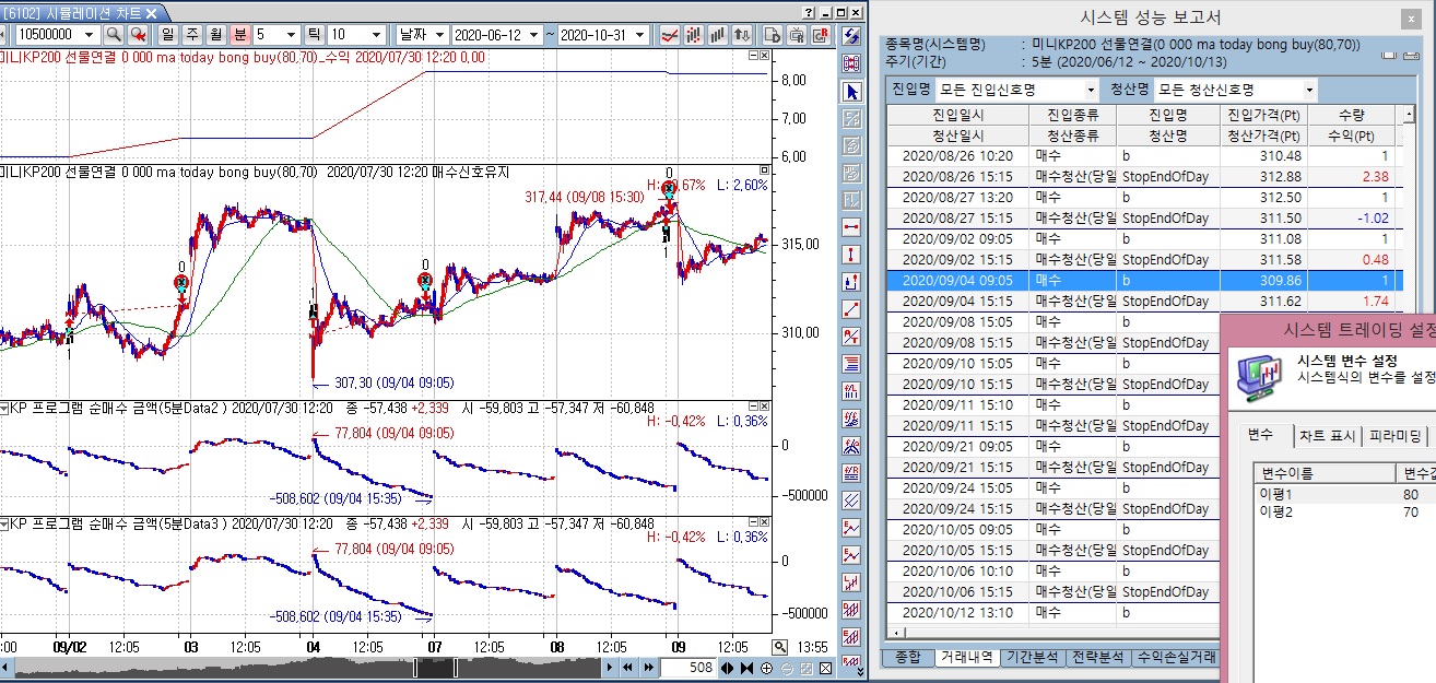 주차트는 선물이고 보조차트2와3은 프로그램순매수금액이고 모두 5분봉입니다.