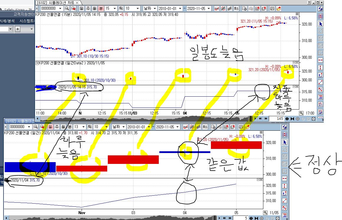 일봉만 켜놓은것보다 지표가 하루씩 늦게 나오더라구요.