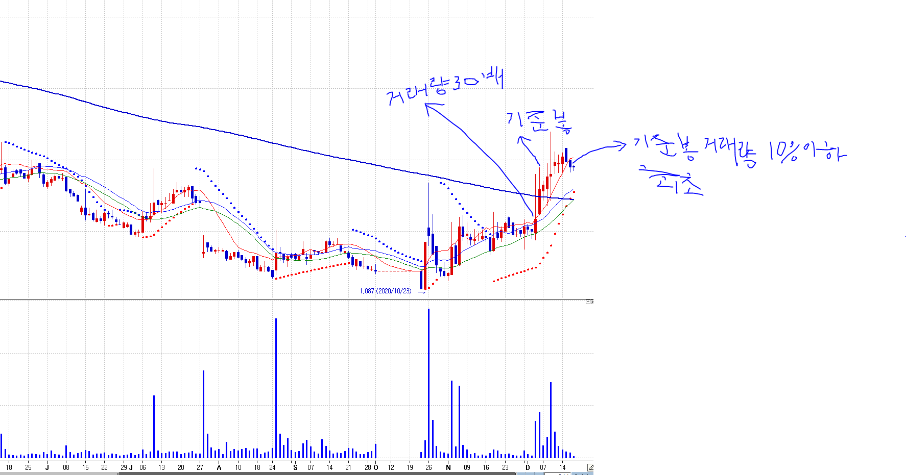 그래서, 기준일 거래량의 10%이하의 거래량을 처음으로 만족하는 종목을 찾고 싶습니다.