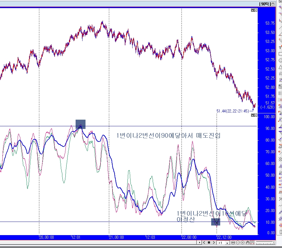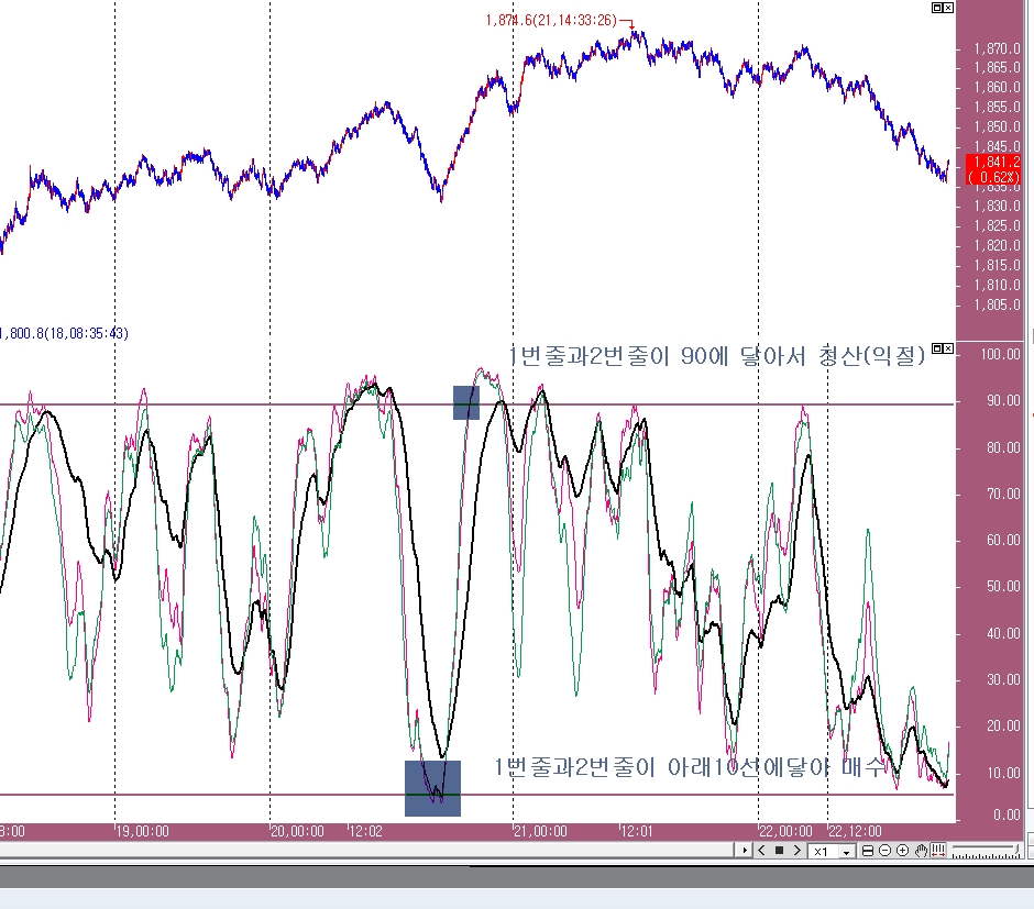 위3번이 수치 90에 도달시 청산(손절) /위 1번이나2번이 수치 10에 도달시 청산(익절)