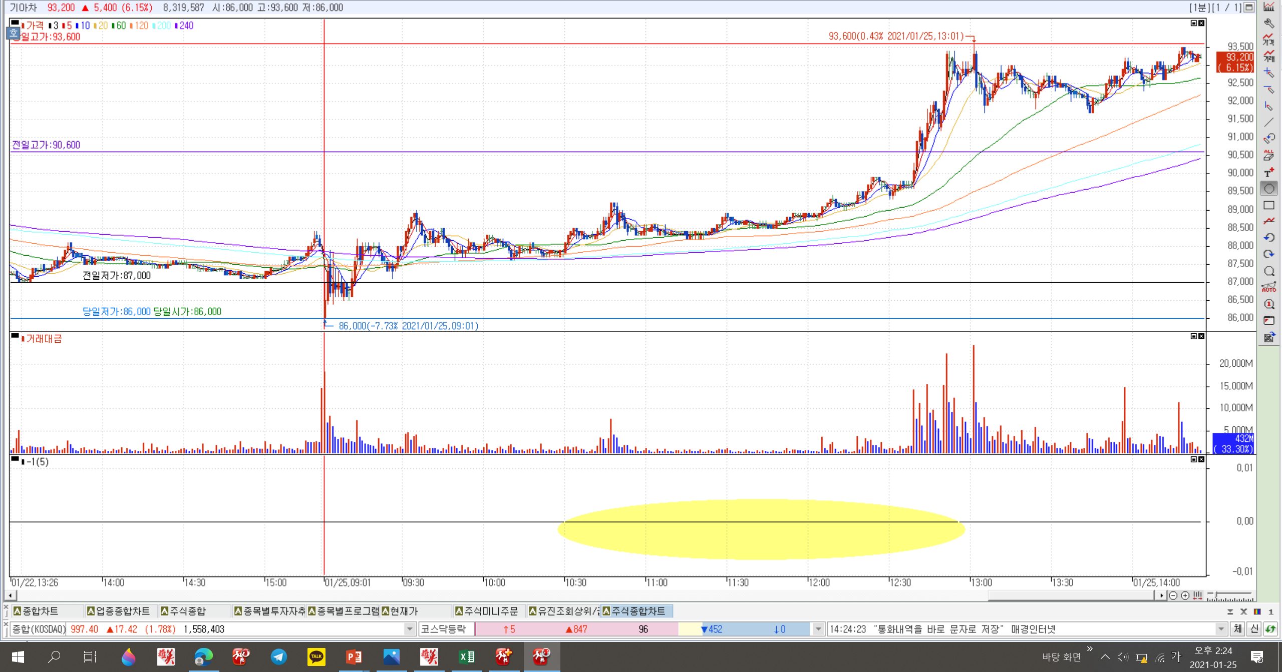 > 일봉5일선이 1분봉에 나오는 식을 부탁드려서 적용해봤는데 이렇게 가로선으로 나옵니다