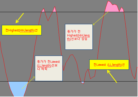 두개의 기준선 前Highest(HH,length), 前Lowest (LL,length)을 기준으로 종가가