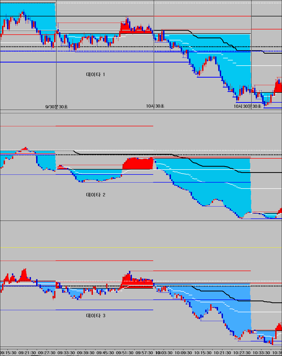 수정1..위그림은30초차트입니다.시간라인이 정시보다30초늧게 그려지네요 1분차트에적용