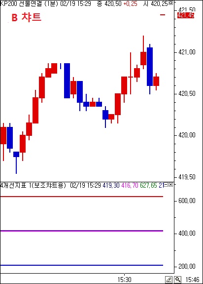 *"B챠트"의 상태에서 지표를 선물연결에 지정후 마우스로 끌어올렸습니다