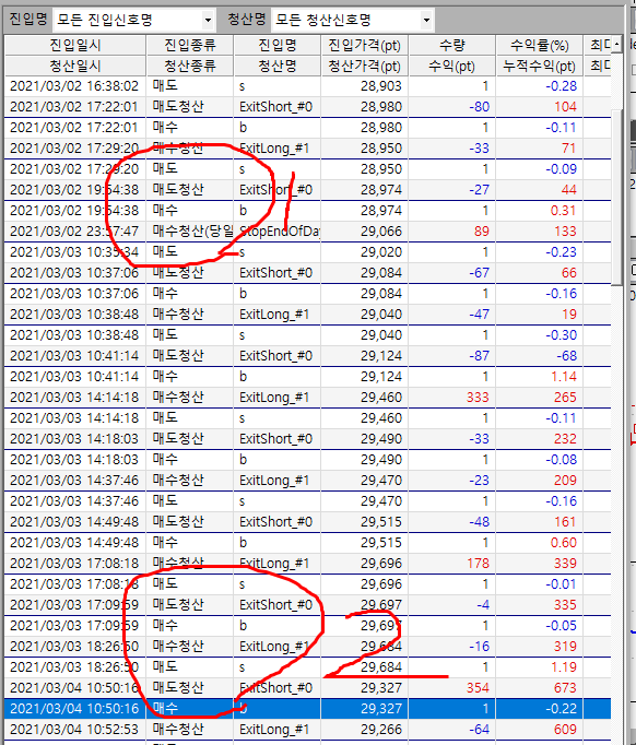 설정한 후 시물레이션을 해보면 어떤 날은 강제청산이 되고 어떤날은 강제청산이 안되고 그 다음날로 넘어가서 청산이 되는데 확실하게 제어하는 방법좀 알려주십시요 감사합니다