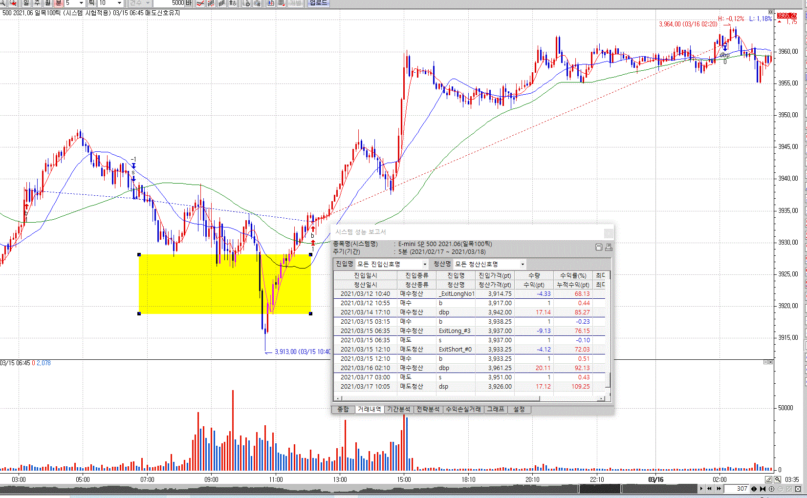 노란색바탕에서 매도의 진입후 청산가격의 수익률이 바탕화면의 실선과 성능보고서에서는 -%가 나옵니다.