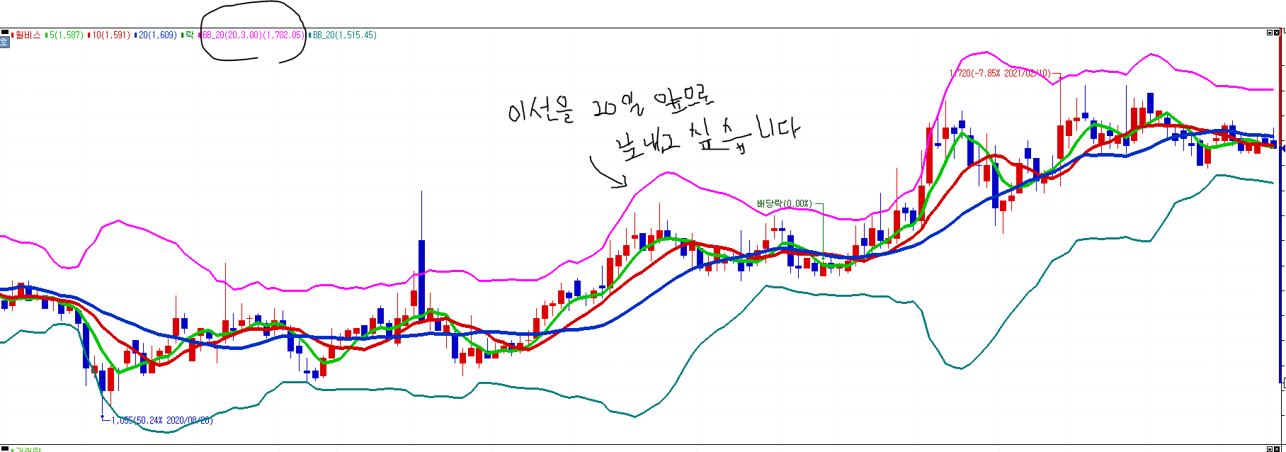 커스텀해서 쓰고 싶은데, 이를테면 20일간의 볼린저밴드의 상한선을 20일앞으로 땡겨서 보