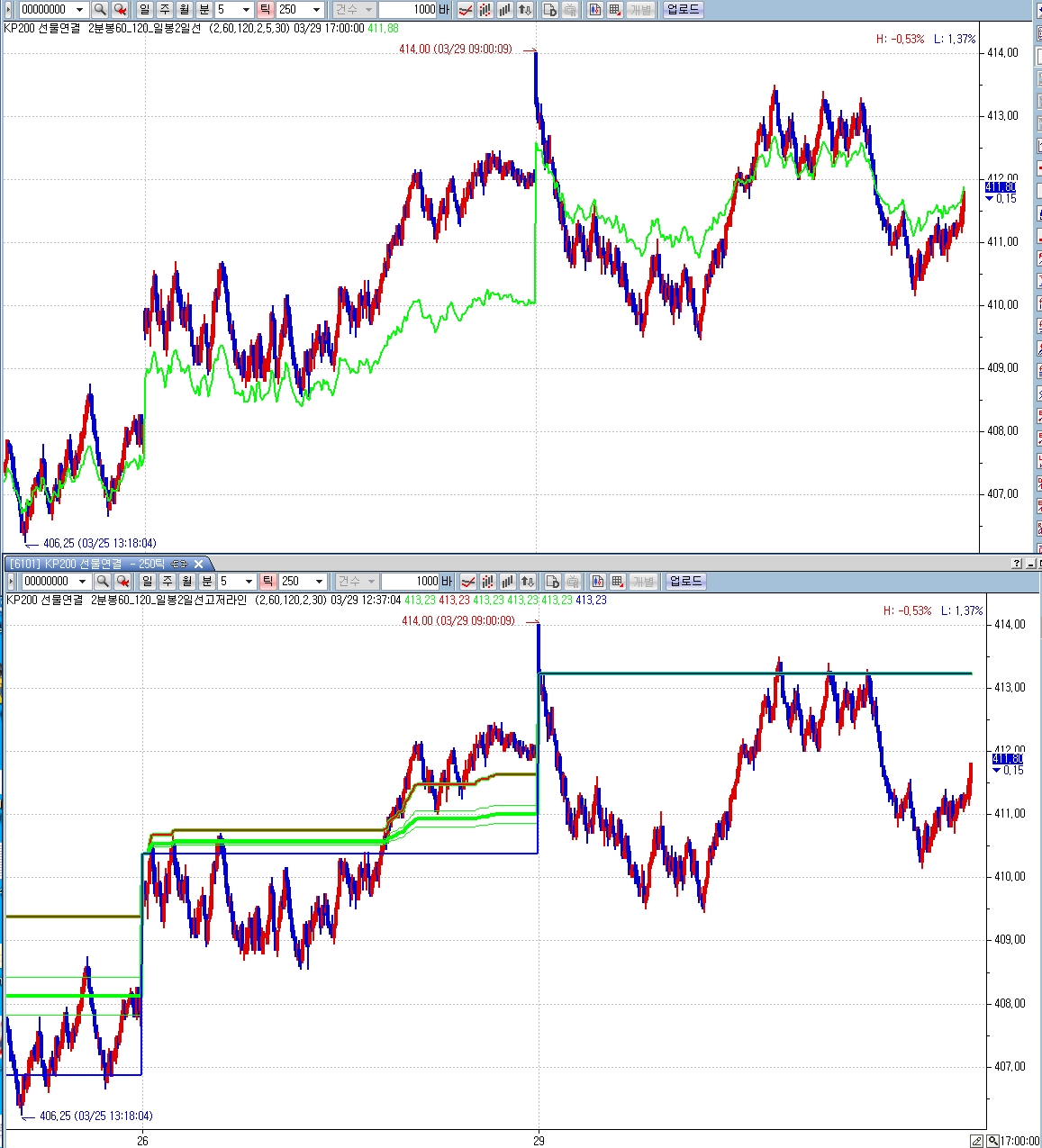 첨부된 상단그림의 녹색라인이 타주기 일봉2일선입니다.