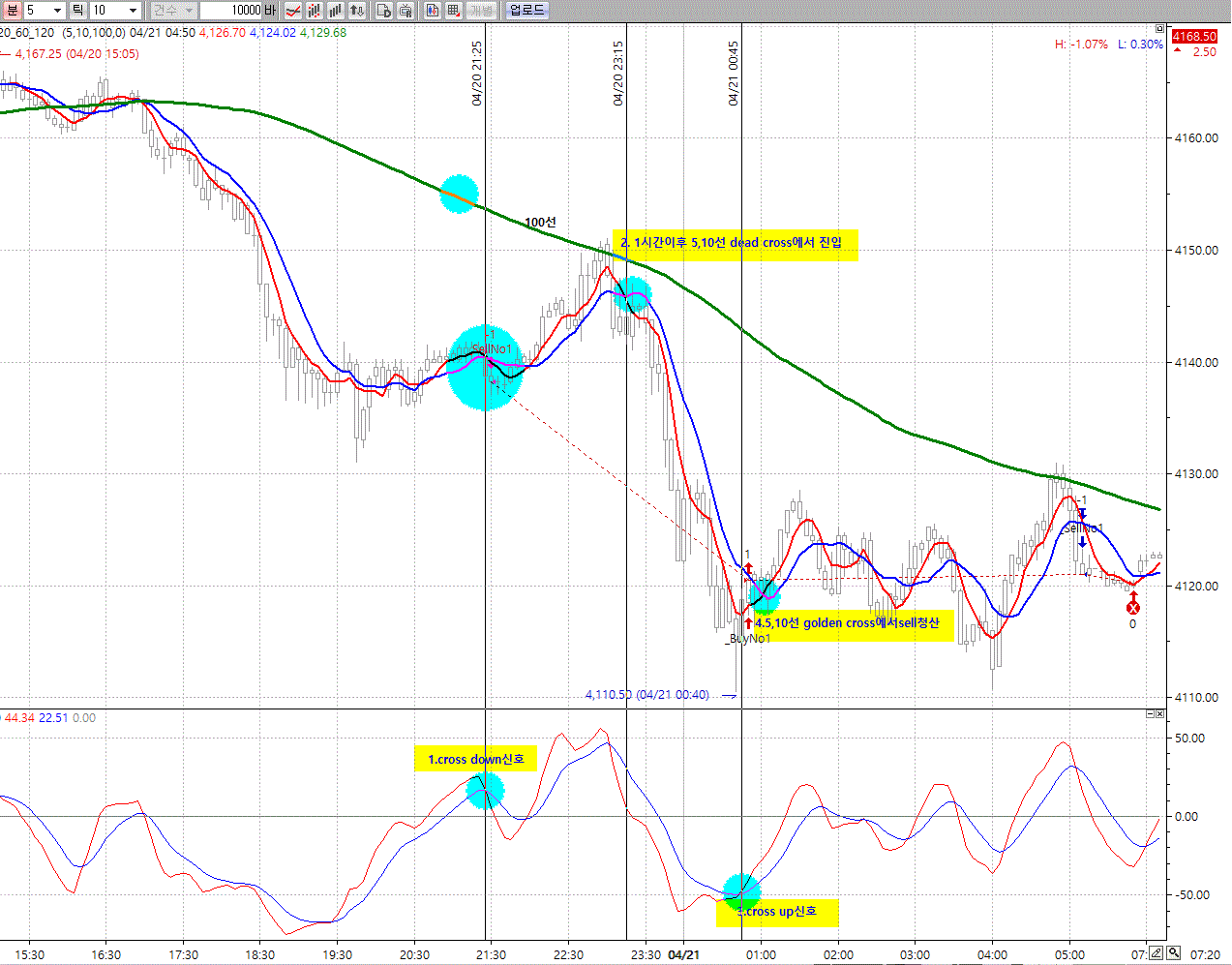 True Strength Index의 cross down 신호시 10분 이후 5,10선 1차 dead cross에서 진입하고